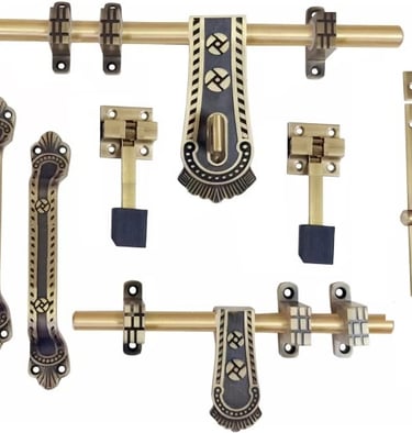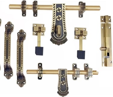 Main door: 10" Brass handle 2 nos (in & out). 2 nos tower bolt, Godrej lock